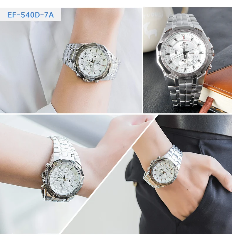 It is very beautiful. It fit my wrist perfect,no need to adjust the strap. Being my first Casio, i am happy with the feel, and look, and I expect this to hold accurate time, since it is of a quality brand. It came in a standard edifice box, with all papers you need. Fine watch.