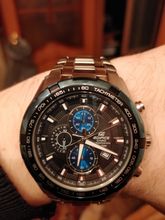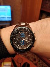 It is very beautiful. It fit my wrist perfect,no need to adjust the strap. Being my first Casio, i am happy with the feel, and look, and I expect this to hold accurate time, since it is of a quality brand. It came in a standard edifice box, with all papers you need. Fine watch.