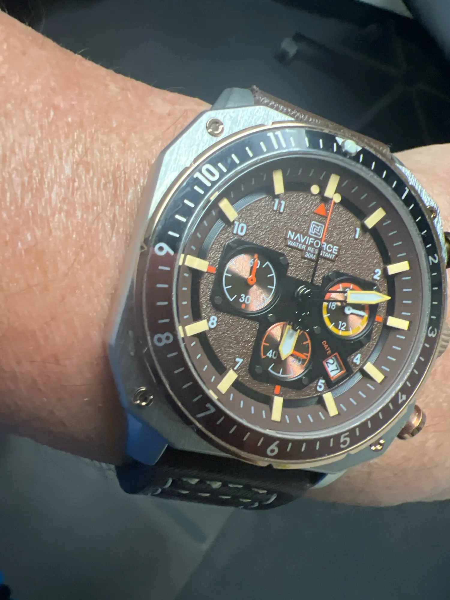 Beautiful watch work very well for 24 hours. ewan doesn’t move second difference i like the color i like the letters stripe fits very well and the big head.
